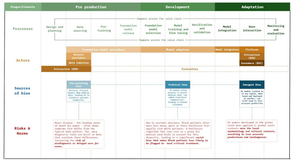 Using this ontological framework, we can further identify where different sources of bias can affect the development process. Below, we map the various pain points across the AI value chain where the different sources of bias can arise, and additionally, how these biases manifest risks and harm in the context of the health sector.